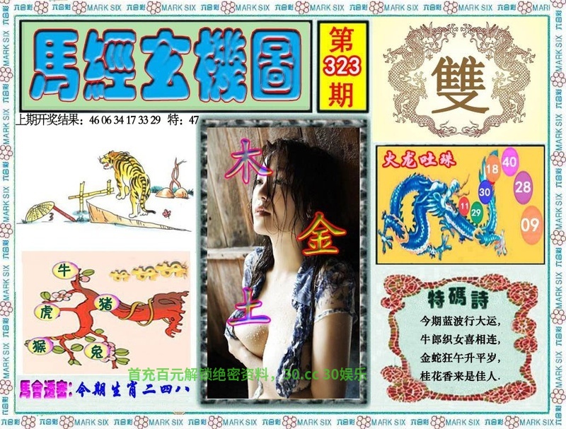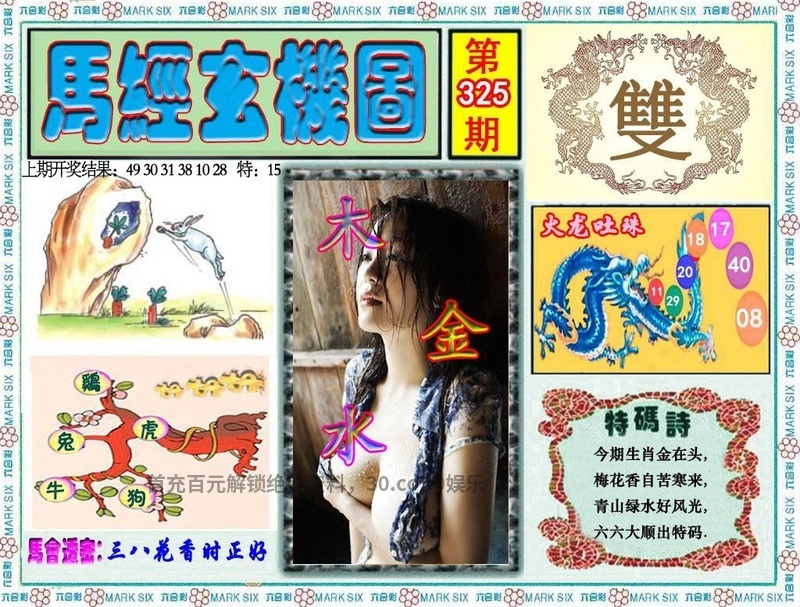 325期马经玄机 特碼詩:今期生肖金在头,梅花香自苦寒来,青山绿水好风光,六六大顺出特码. 解肖:鸡兔牛狗虎 |